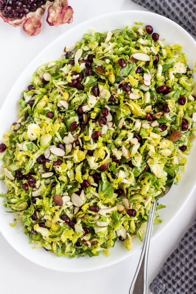 A simple, delicious salad of shredded Brussels sprouts, sweet pomegranate arils and slivered almonds dressed in a light and refreshing lemony vinaigrette. This Brussels Sprout Pomegranate Salad is sure to impress!